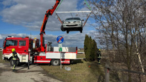 Wir rückten mit dem Wechselladefahrzeug aus. Das nicht mehr fahrbereite Auto wurde mittels Kran geborgen und am Lagerplatz der Gemeinde gesichert abgestellt.